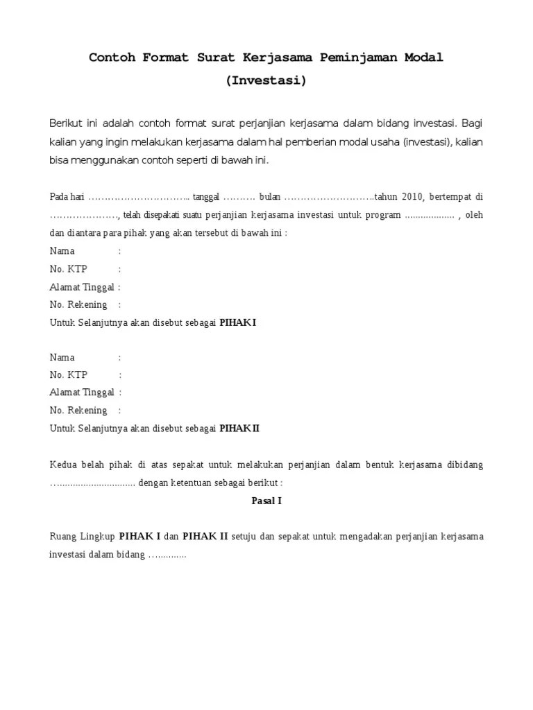 Perjanjian kerjasama tidak hanya melulu tentang investasi atau kerjasama dagang lainnya. Contoh surat perjanjian kerjasama rumah makin / cafe. Contoh surat perjanjian kerjasama investasi. Dalam surat perjanjian kerjasama ini pihak kedua meminjam uang sebesarrp.40.000.000 ( empat puluh juta rupiah) kepada pihak pertama untuk usaha dan semoga apa yang kami posting hari ini termasuk contoh surat perjanjian kerjasama investasi dapat membantu anda dalam membuat. Jika anda merasa cocok dengan tawaran kerjasama 3.